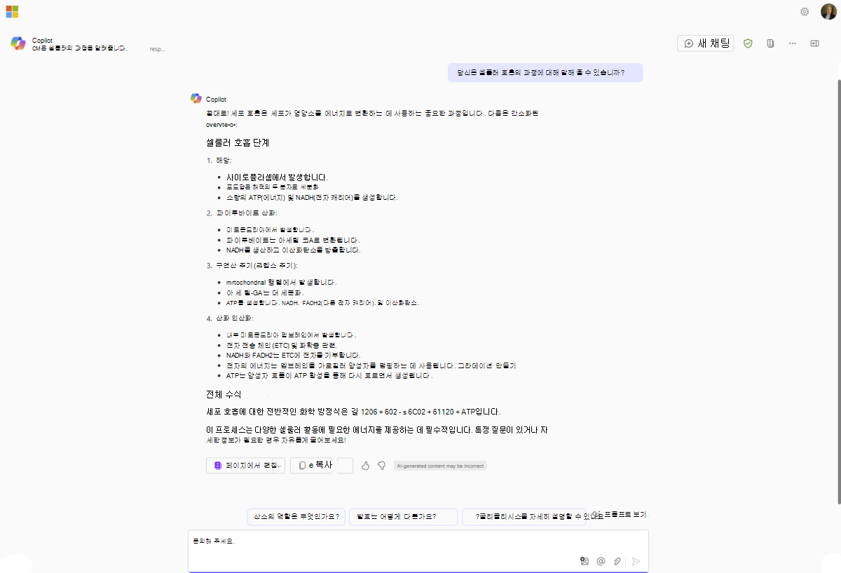 AI는 실수할 수 있습니다. 사용자가 판단해야 합니다. Copilot Chat 응답에 따라 결정을 내리거나 행동하기 전에 사실과 연결된 출처를 두 번 검사. Copilot Chat 피드백 옵션을 사용하여 응답을 평가합니다.
