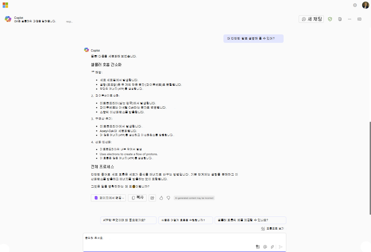 Copilot Chat 환경에서 교육자는 후속 질문을 할 수 있습니다. 다양하고 더 자세한 답변을 얻기 위한 질문의 예는 다음과 같습니다.