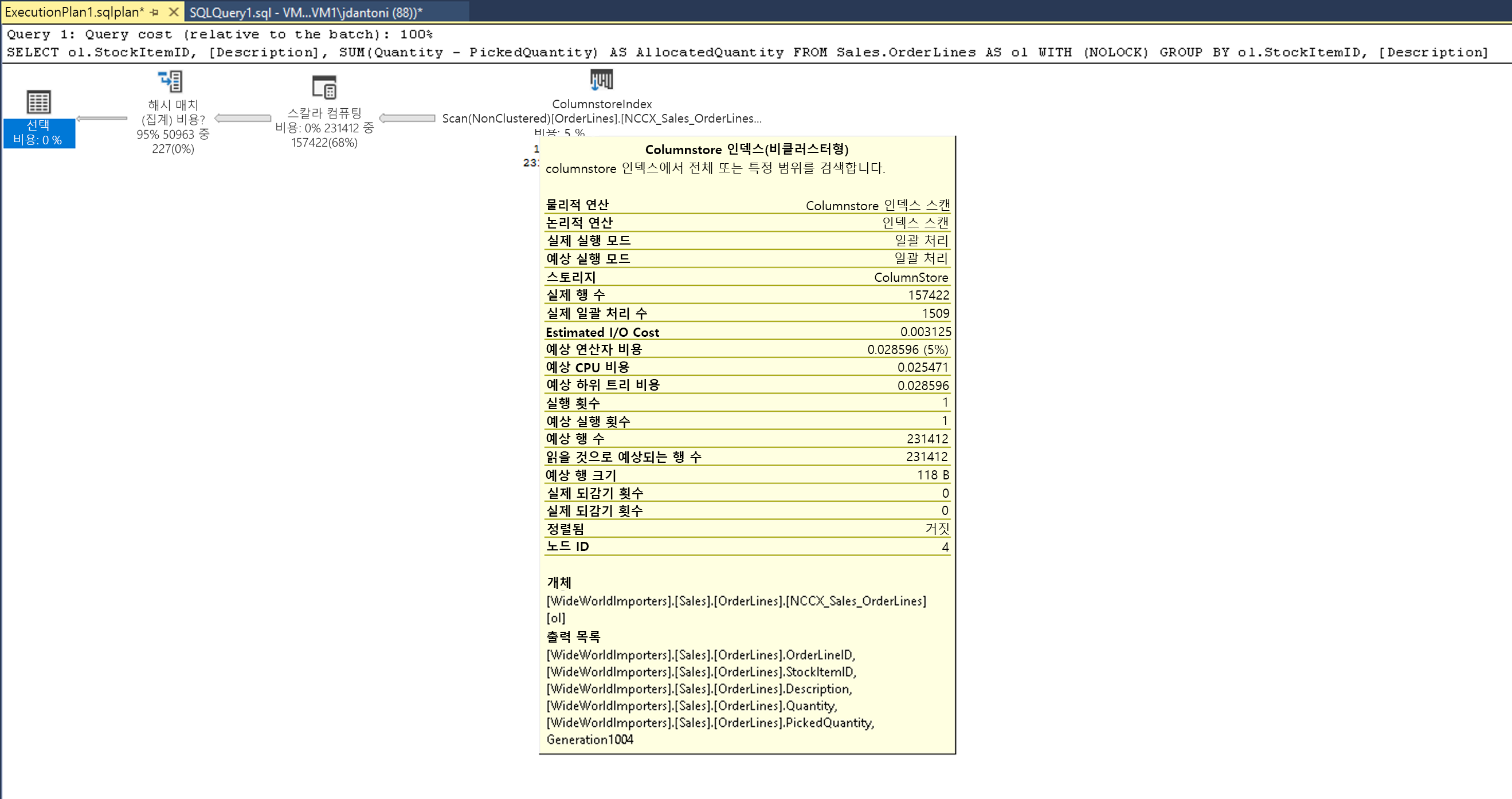 다음 이미지의 Columnstore 인덱스 스캔 속성에서 볼 수 있듯이, 캐시에서 가져온 실행 계획에는 쿼리된 실제 행 수가 포함되어 있습니다.