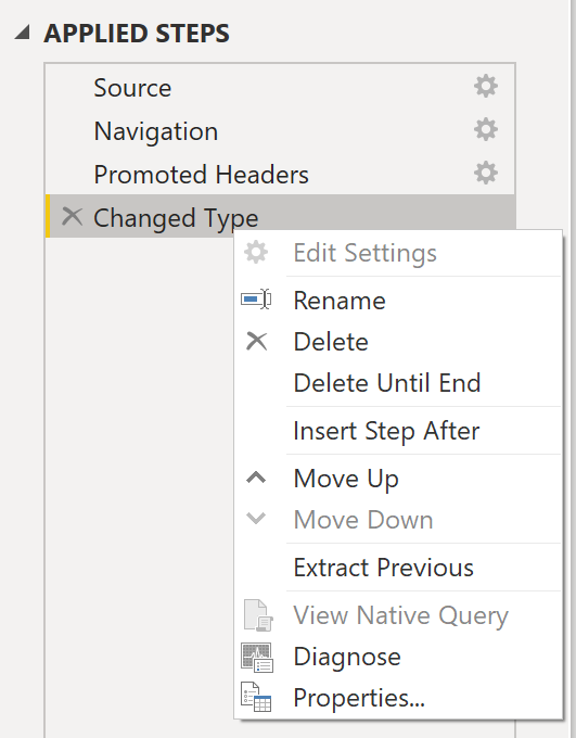 다음 시나리오에서는 쿼리 정리의 실제 용례를 보여줍니다. 이 시나리오에서는 여러 테이블에 쿼리 세트를 적용합니다. 파워 쿼리를 사용하여 새 데이터 원본을 추가하고 Power Query 편집기로 이동한 후, 다음 그림에서 보는 바와 같이 쿼리 설정 창으로 이동하여 마지막에 적용된 단계를 마우스 오른쪽 단추로 클릭합니다.