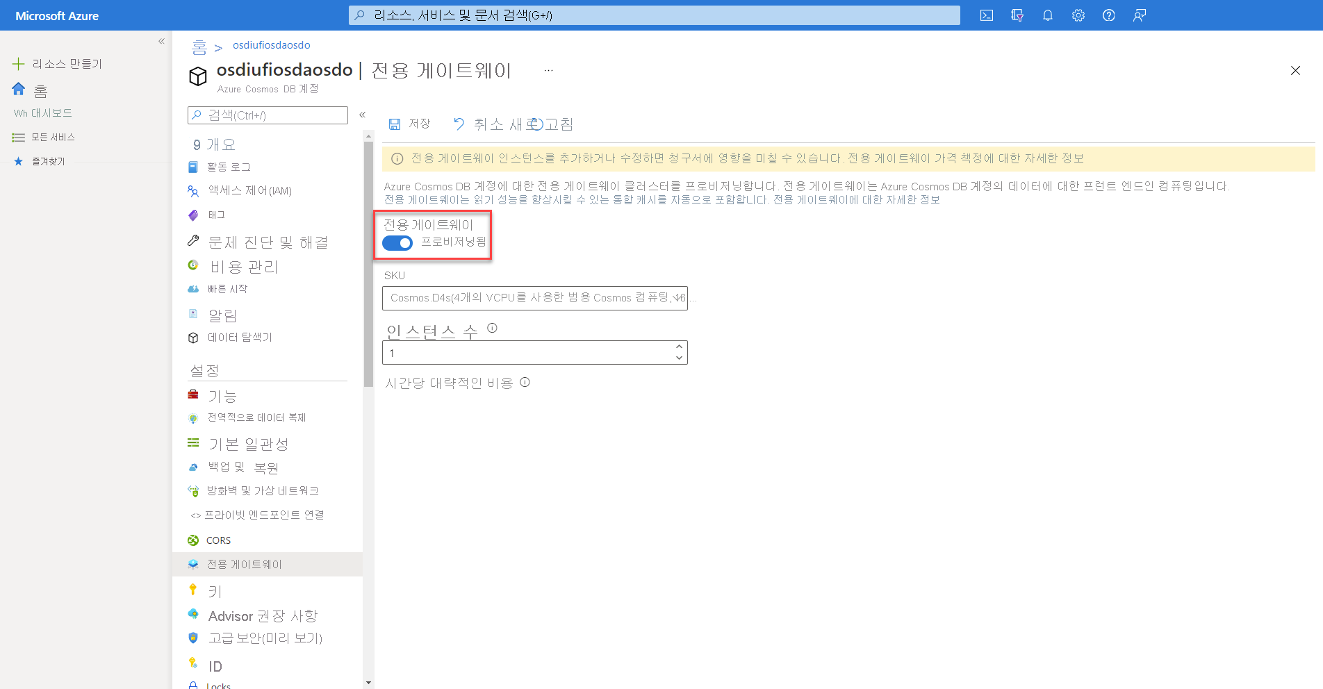 - Azure Cosmos DB for NoSQL 계정에서 전용 게이트웨이 만들기