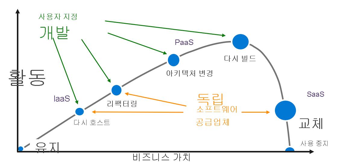 | 5. | 다시 빌드 | PaaS 또는 서버리스 기술을 사용하도록 애플리케이션 다시 빌드 | 최신 기술을 사용하여 데이터 플랫폼 및 애플리케이션을 다시 빌드하면 Azure의 기본 제공 고가용성을 사용하고, 애플리케이션 이식성과 확장성을 높이고, 사용되는 기술과 애플리케이션을 지원/개발하는 직원 간의 잠재적 기술 격차를 최소화할 수 있습니다. |
