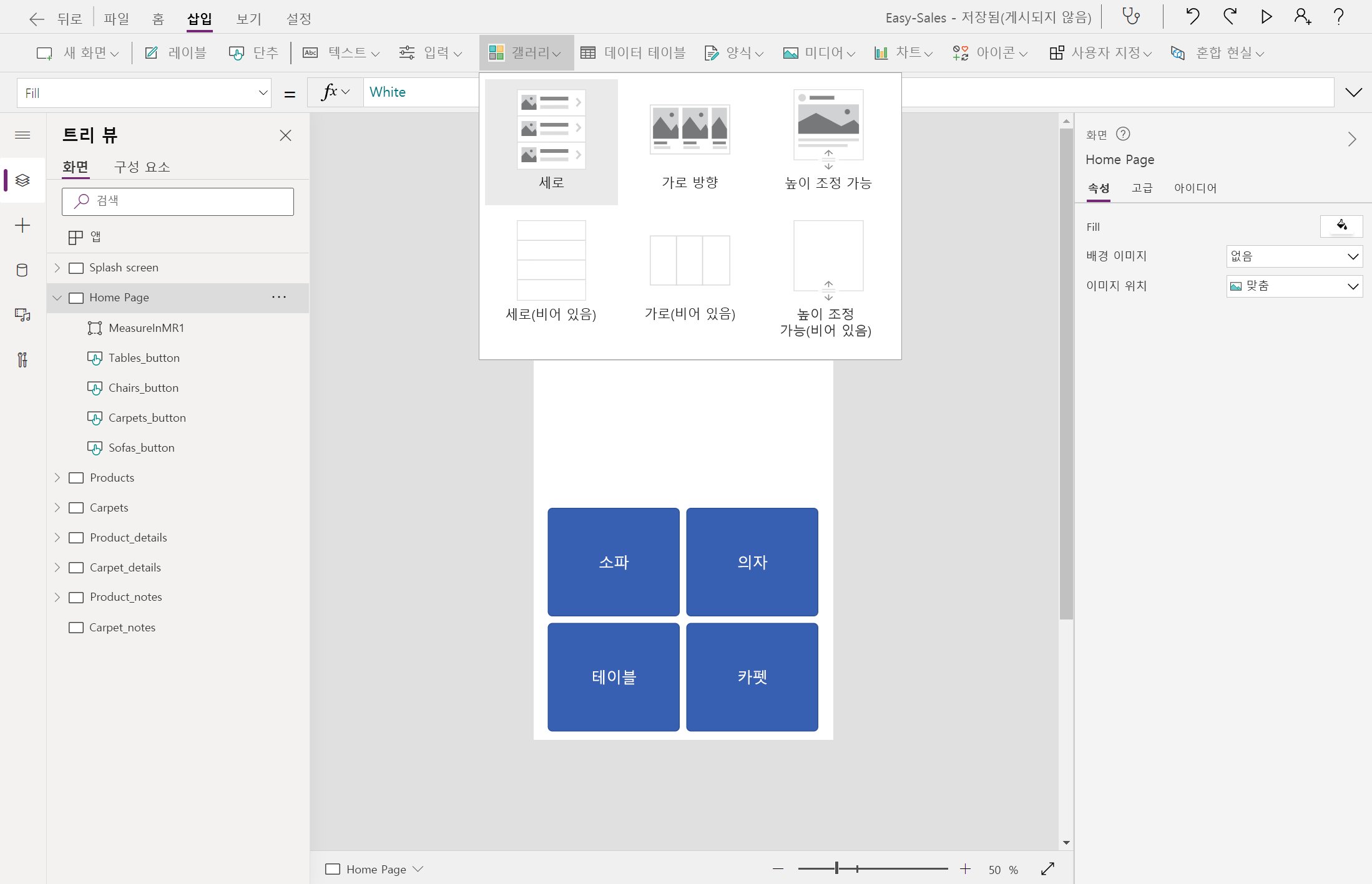 홈 페이지에서 갤러리>를 선택하여 갤러리를 추가합니다. 갤러리의 이름을 Measure_gallery 변경합니다.
