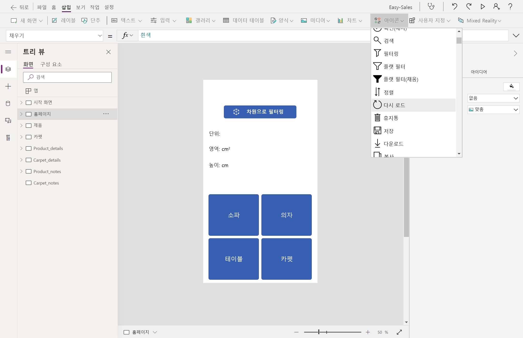 제품과 관련된 다른 기능이 추가되므로 카펫 페이지에는 공간 필터링이 포함되지 않습니다. MR 세션의 측정값에서 측정된 영역은 선택한 카펫의 가격을 예측하는 데 사용됩니다.