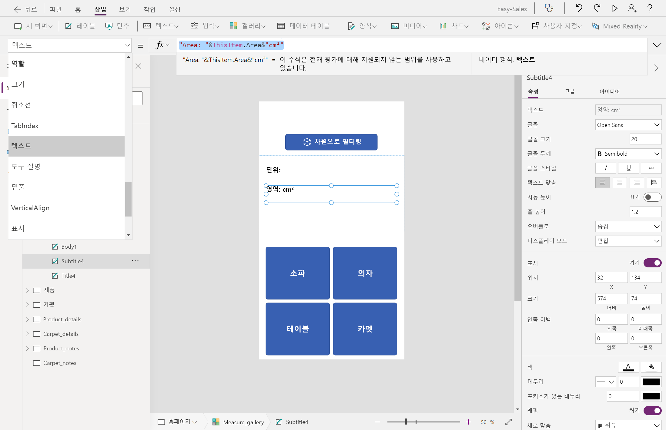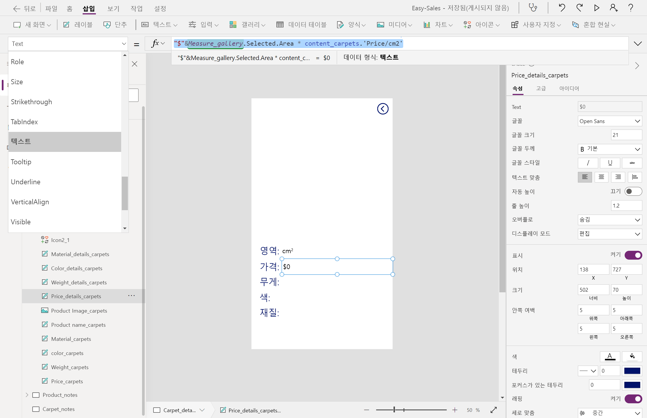 Measure_gallery.Selected.Area&"cm²"다음과 같이 가격 레이블 옆에 레이블을 구성하여 계산된 가격을 표시합니다.