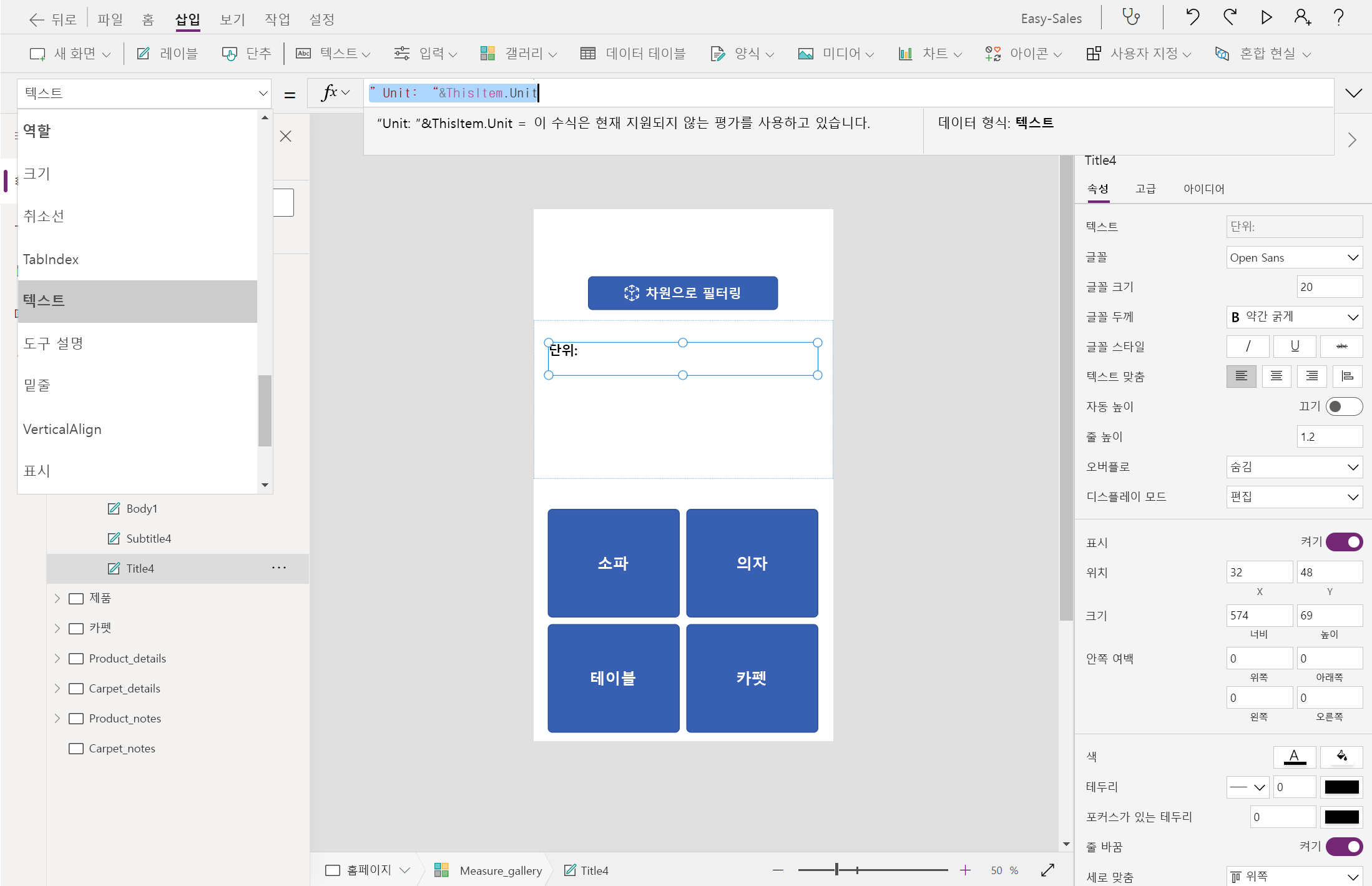 If( ID = 1 And Measure_gallery.Selected.Height = 0, (Filter('Easy Sales',(ProductCategory = "Sofa") And ((Depth < Measure_gallery.Selected.BoundingDepth And Width < Measure_gallery.Selected.BoundingWidth) Or (Depth < Measure_gallery.Selected.BoundingWidth And Width < Measure_gallery.Selected.BoundingDepth)))), ID = 1 And Measure_gallery.Selected.Height > 0, (Filter('Easy Sales',(ProductCategory = "Sofa") And ((Depth < Measure_gallery.Selected.BoundingDepth And Width < Measure_gallery.Selected.BoundingWidth And Height <= Measure_gallery.Selected.Height) Or (Depth < Measure_gallery.Selected.BoundingWidth And Width < Measure_gallery.Selected.BoundingDepth And Height <= Measure_gallery.Selected.Height)))), ID = 1, Filter('Easy Sales',ProductCategory = "Sofa"), ID = 2, Filter('Easy Sales',ProductCategory = "Chair"), ID = 2 And Measure_gallery.Selected.Height = 0, (Filter('Easy Sales',(ProductCategory = "Chair") And ((Depth < Measure_gallery.Selected.BoundingDepth And Width < Measure_gallery.Selected.BoundingWidth) Or (Depth < Measure_gallery.Selected.BoundingWidth And Width < Measure_gallery.Selected.BoundingDepth)))), ID = 2 And Measure_gallery.Selected.Height > 0, (Filter('Easy Sales',(ProductCategory = "Chair") And ((Depth < Measure_gallery.Selected.BoundingDepth And Width < Measure_gallery.Selected.BoundingWidth And Height <= Measure_gallery.Selected.Height) Or (Depth < Measure_gallery.Selected.BoundingWidth And Width < Measure_gallery.Selected.BoundingDepth And Height <= Measure_gallery.Selected.Height)))), ID = 3, Filter('Easy Sales',ProductCategory = "Table"), ID = 3 And Measure_gallery.Selected.Height = 0, (Filter('Easy Sales',(ProductCategory = "Table") And ((Depth < Measure_gallery.Selected.BoundingDepth And Width < Measure_gallery.Selected.BoundingWidth) Or (Depth < Measure_gallery.Selected.BoundingWidth And Width < Measure_gallery.Selected.BoundingDepth)))), ID = 3 And Measure_gallery.Selected.Height > 0, (Filter('Easy Sales',(ProductCategory = "Table") And ((Depth < Measure_gallery.Selected.BoundingDepth And Width < Measure_gallery.Selected.BoundingWidth And Height <= Measure_gallery.Selected.Height) Or (Depth < Measure_gallery.Selected.BoundingWidth And Width < Measure_gallery.Selected.BoundingDepth And Height <= Measure_gallery.Selected.Height)))) )중요합니다