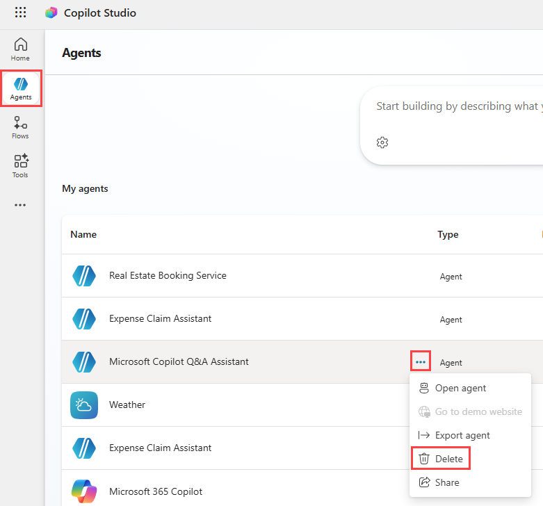When editing an agent, you can select the Delete button on the command bar to delete the agent and enter the name of the agent to confirm deletion.