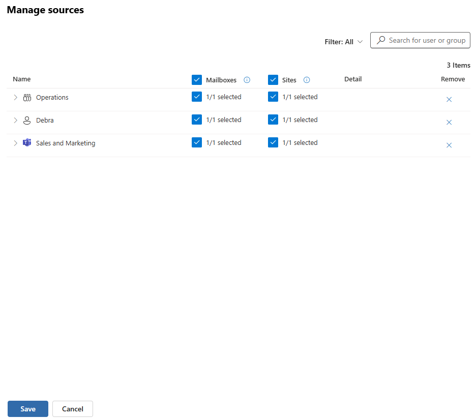 사용자 또는 그룹을 원본으로 선택한 후 관리 단추를 사용하여 각 원본에 대해 포함되는 데이터 위치를 검토하고 조정합니다. 사용자의 경우 사서함과 OneDrive 사이트를 선택할 수 있습니다. 그룹의 경우 그룹 사서함 및 연결된 SharePoint 사이트를 선택할 수 있습니다.