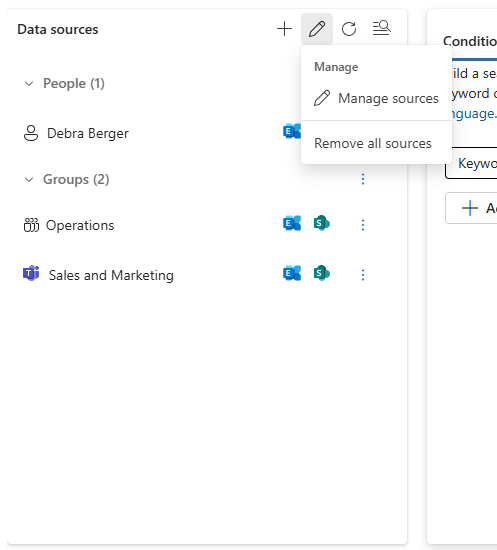 선택 항목을 저장한 후 언제든지 검색으로 돌아가 데이터 원본을 업데이트할 수 있습니다. 사례 내의 검색 탭에서 관련 검색을 열고 데이터 원본 섹션에서 원본 관리 아이콘을 선택합니다. 이렇게 하면 다음을 수행할 수 있습니다.