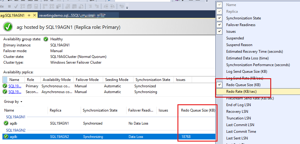 복구 큐 크기는 각 보조 복제본 및 데이터베이스에 고유합니다. 따라서 가용성 그룹 데이터베이스의 복구 큐를 검토하려면 다음 단계를 수행합니다.