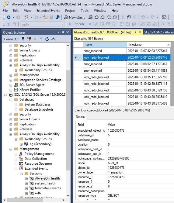 차단된 다시 실행의 기록 증거를 확인하려면 SSMS를 사용하여 보조 복제본에서 AlwaysOn_health Xevent 추적 파일을 엽니다. lock_redo_blocked 이벤트를 찾습니다.