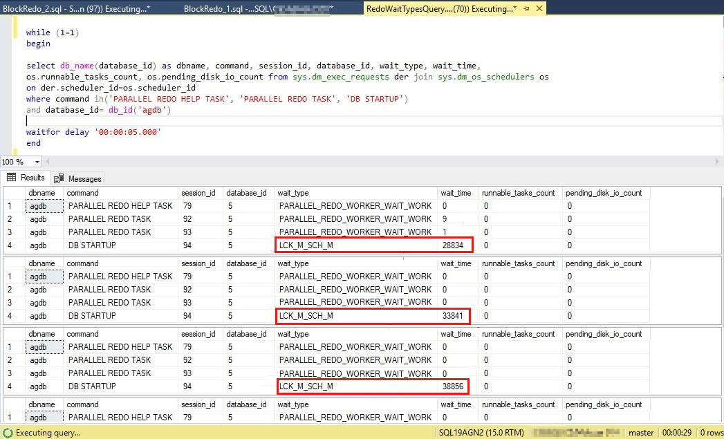 다시 실행 스레드가 획득하려고 시도하는 스키마 수정 잠금 대기 유형을 모니터링합니다. 이렇게 하려면 앞에서 설명한 쿼리를 사용하여 다시 실행 작업에 대해 보고된 대기 유형을 확인합니다 sys.dm_exec_requests. 진행 중인 다시 실행 차단에서 증가하는 대기 시간을 LCK_M_SCH_M 관찰할 수 있습니다.