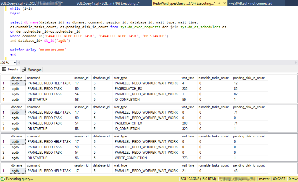 특정 보조 복제본 가용성 그룹 데이터베이스에 대한 복구 큐를 식별한 후 보조 복제본에 연결한 다음 쿼리 sys.dm_exec_requests 하여 복구 스레드를 wait_time 확인 wait_type 합니다. 루프에서 실행할 수 있는 쿼리는 다음과 같습니다. 하나 이상의 대기 유형에 대한 빈도가 높고 이러한 대기 유형에 대한 대기 시간도 찾고 있습니다. 다음은 매 초마다 실행되고 가용성 그룹 "agdb"에 대한 대기 유형 및 대기 시간을 보고하는 샘플 쿼리입니다.