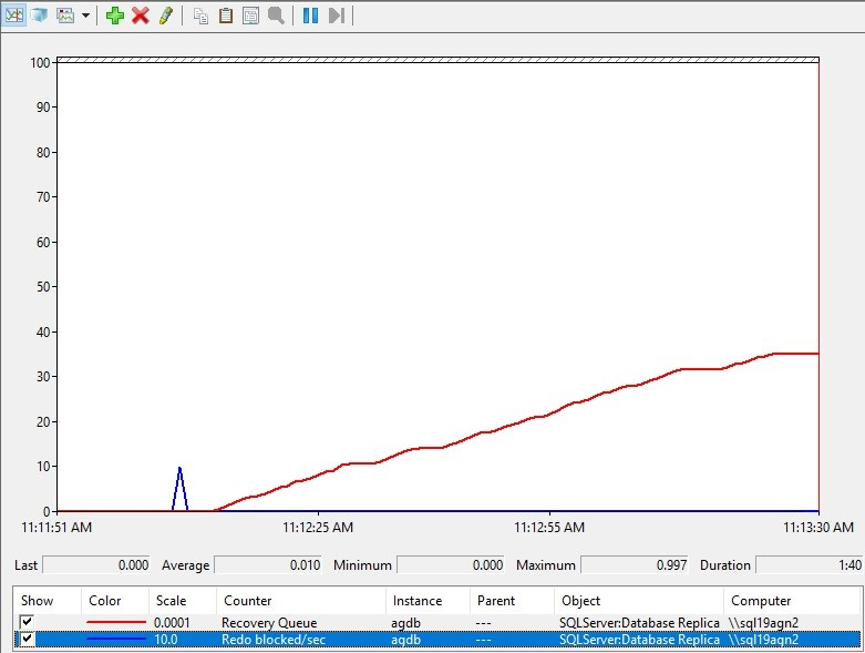 성능 모니터 사용하여 복구 큐에 대한 차단된 다시 실행 영향을 적극적으로 모니터링합니다. SQL Server::D atabase Replica::Redo blocked/sec 및 SQL Server::D atabase Replica::Recovery Queue 카운터를 추가합니다. 다음 스크린샷은 주 복제본에 대해 실행되는 명령을 보여 ALTER TABLE ALTER COLUMN 주며 장기 실행 쿼리는 보조 복제본의 동일한 테이블에 대해 실행됩니다. Redo blocked/sec 카운터는 명령이 실행됨을 ALTER TABLE ALTER COLUMN 나타냅니다. 장기 실행 쿼리가 보조 복제본의 동일한 테이블에서 실행되는 동안 주 복제본의 후속 변경으로 인해 복구 큐가 증가합니다.