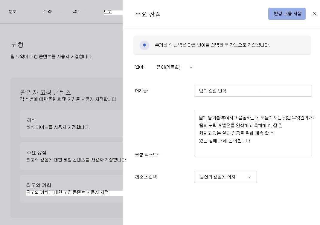 표시되는 편집 창에서 헤더, 코칭 텍스트 및 리소스 필드 선택을 업데이트하여 강점과 기회를 위한 콘텐츠를 사용자 지정합니다. 리소스 선택 옵션은 해석 가이드에 대한 편집 가능한 유일한 콘텐츠입니다.