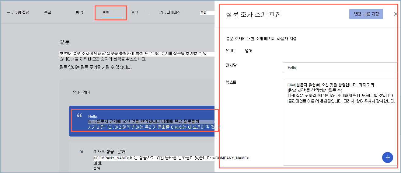 - 설문 조사 프로그램의 질문 섹션을 선택하고 설문 조사 소개 섹션을 선택합니다.