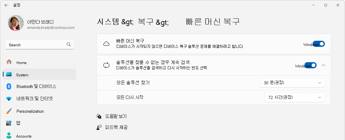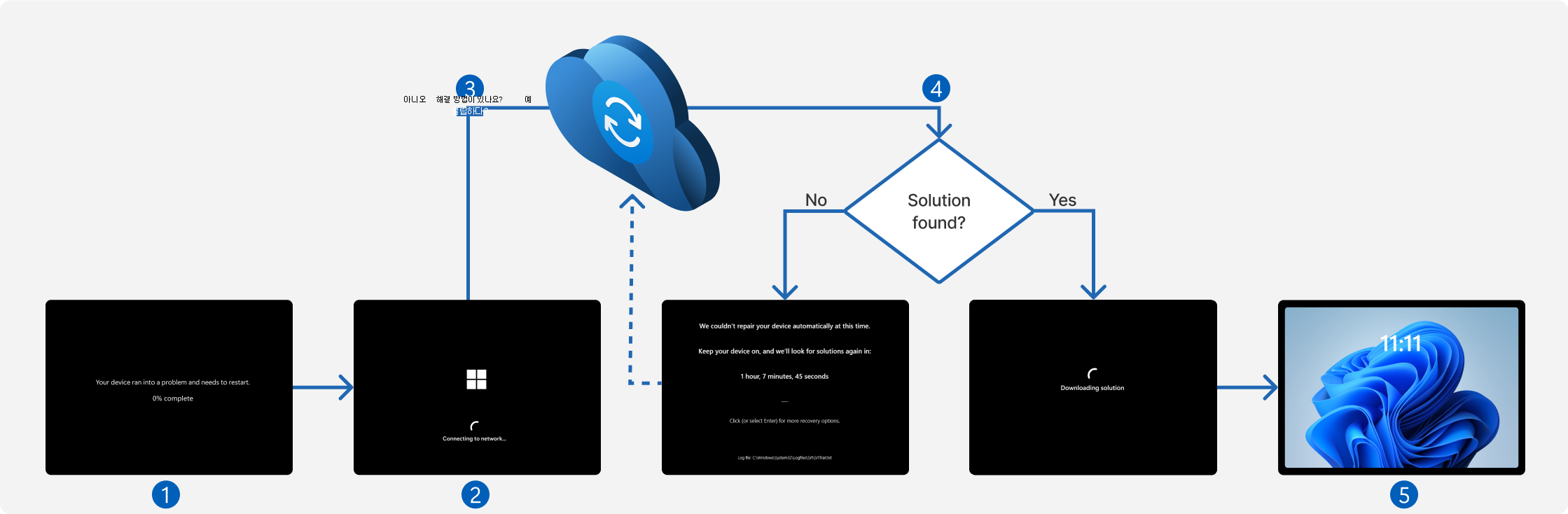 시작 복구를 기반으로 구축된 빠른 머신 복구는 보안 및 연결된 Windows 복구 환경을 사용하여 Windows 업데이트 수정 옵션을 검사합니다. 이렇게 하면 수동 개입 없이 디바이스를 복구할 수 있습니다.