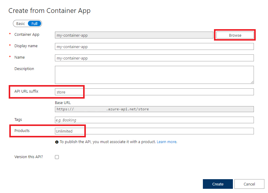 Associate the API with a product. Select Full and then, in Product, select the product. In this case, the Unlimited product is used. If you want the API to be published and be available to developers, you need to add it to a product.