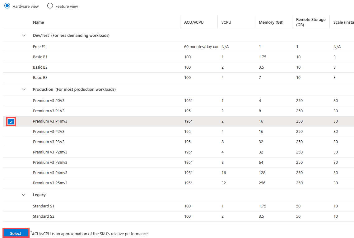 Select one of the pricing tiers and then select Select.