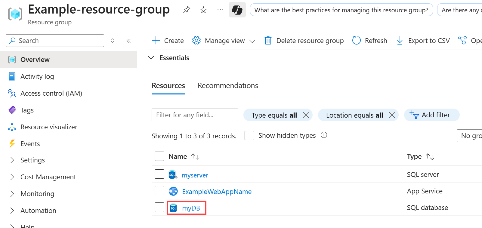 On the Overview page for the resource group, select a resource that you want to scale. The following screenshot shows a SQL Database resource.