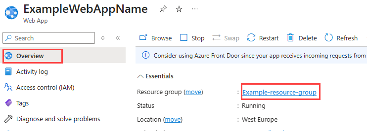 On the Overview page for your app, select the link to the resource group.