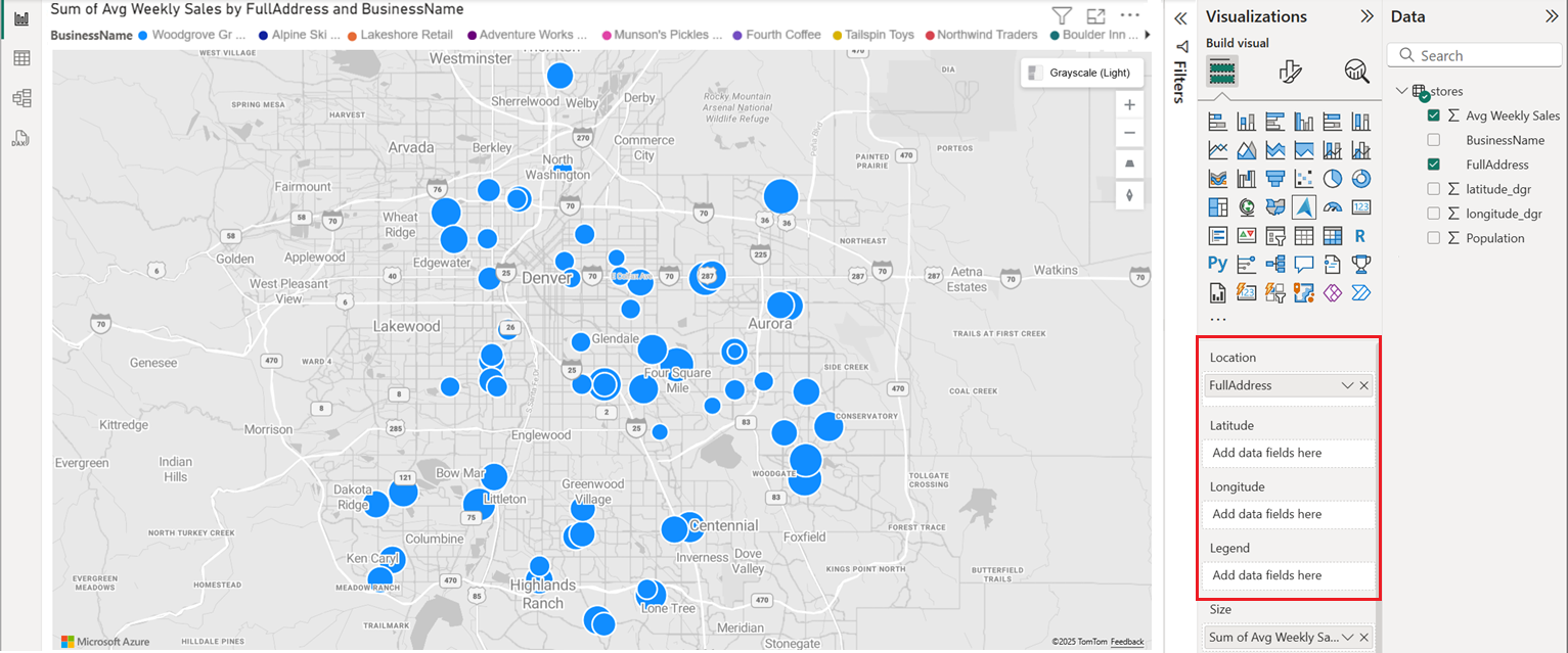 Performing one of the two following actions in the Fields pane provides the minimal data needed to load the Azure Maps visual: