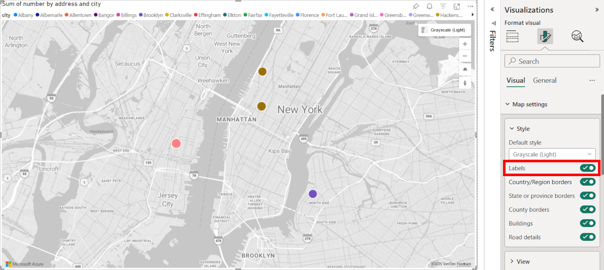 | Labels | A toggle switch that allows you to show or hide map labels. For more information, see item number five in the previous section titled Use the Azure Maps Power BI visual. |