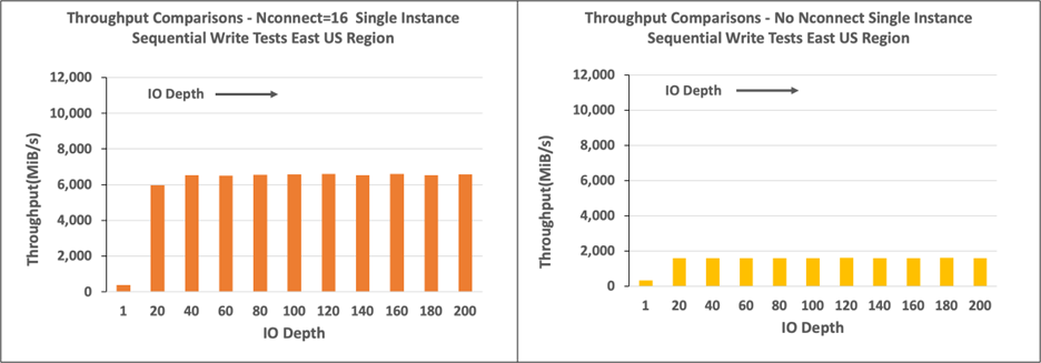 The following graphs show sequential writes. Using nconnect provides observable benefits for sequential writes at 6,600 MiB/s, roughly four times that of mounts without nconnect.