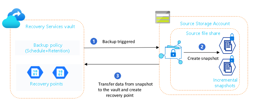 Backup tier Description Snapshot tier The File Share snapshot is created using the File Share API. The snapshot URL is stored in the metadata store only. Vault-Standard tier Once the File Share snapshot is created, the changed files and data blocks since the last backup are identified and transferred to the vault. The time taken for data transfer depends on the amount of data and number of files changed. You can restore the Azure Files contents (individual files or the full share) from snapshots available on the source File Share. Once the operation is triggered, the snapshot URL is retrieved from the metadata store, and the data is listed and transferred from the source snapshot to the target File Share of your choice.