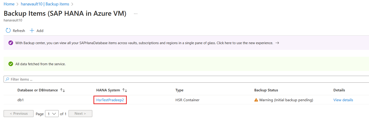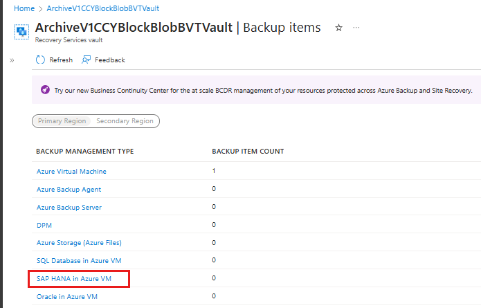 On the Backup Items blade, select the Backup Management Type as SAP HANA in Azure VM.
