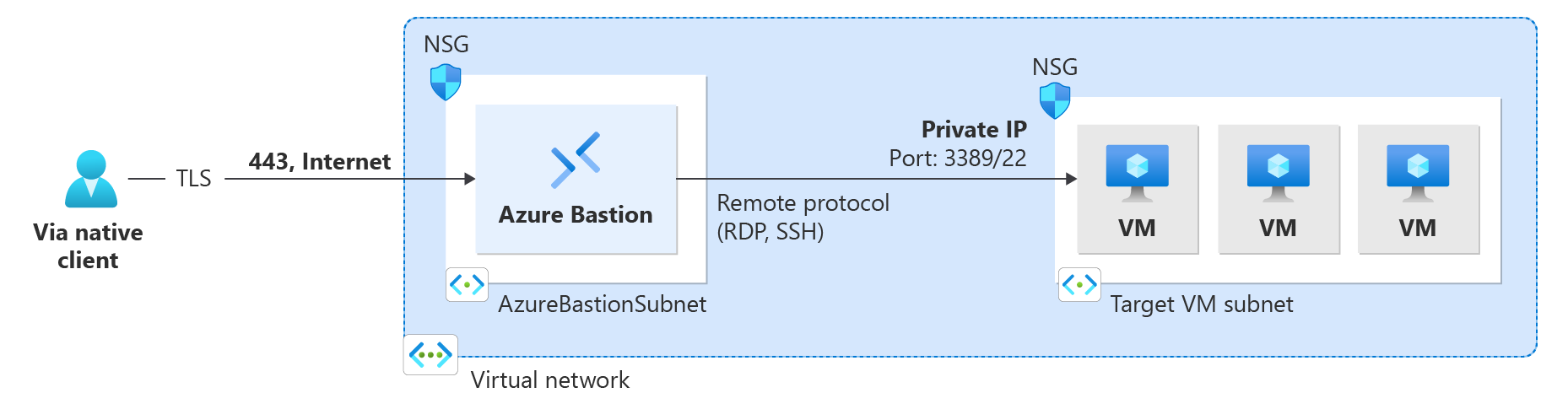 You can configure this feature by modifying an existing Bastion deployment, or you can deploy Bastion with the feature configuration already specified. Your capabilities on the VM when connecting via native client are dependent on what is enabled on the native client. Keep in mind that at this time, session recording isn't available for native client.