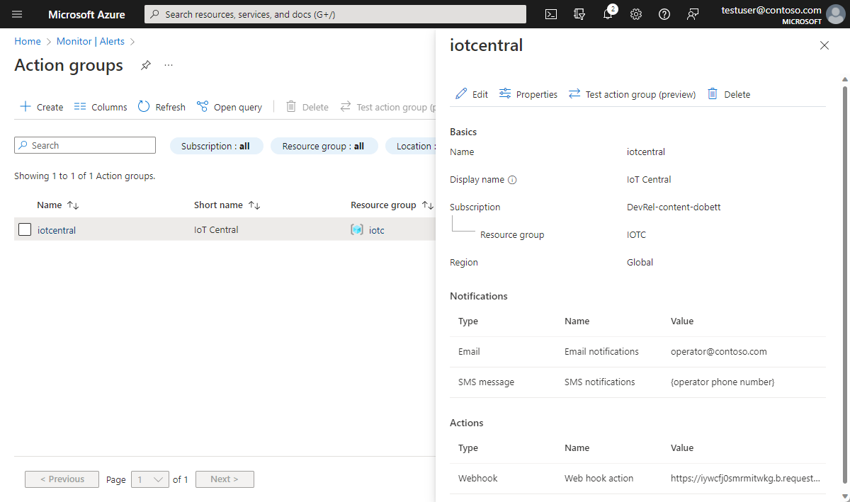 To use an action group in an IoT Central rule, the action group must be in the same Azure subscription as the IoT Central application.