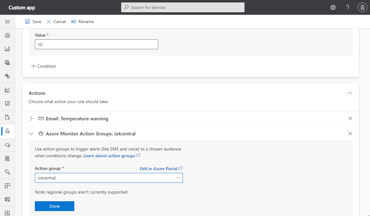 Now that you know how to configure a rule in your Azure IoT Central application, you can learn how to configure advanced rules using Power Automate or Azure Logic Apps.