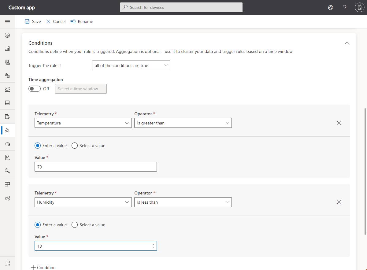 In the following screenshot, the conditions check when the temperature is greater than 70° F and the humidity is less than 10%. When any of these statements are true, the rule evaluates to true and triggers an action.