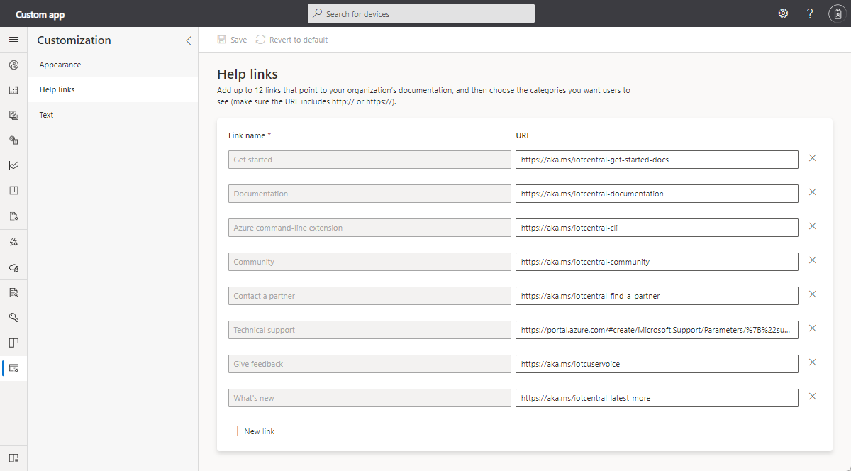 To modify the help links, navigate to the Help links section in the Customization page.