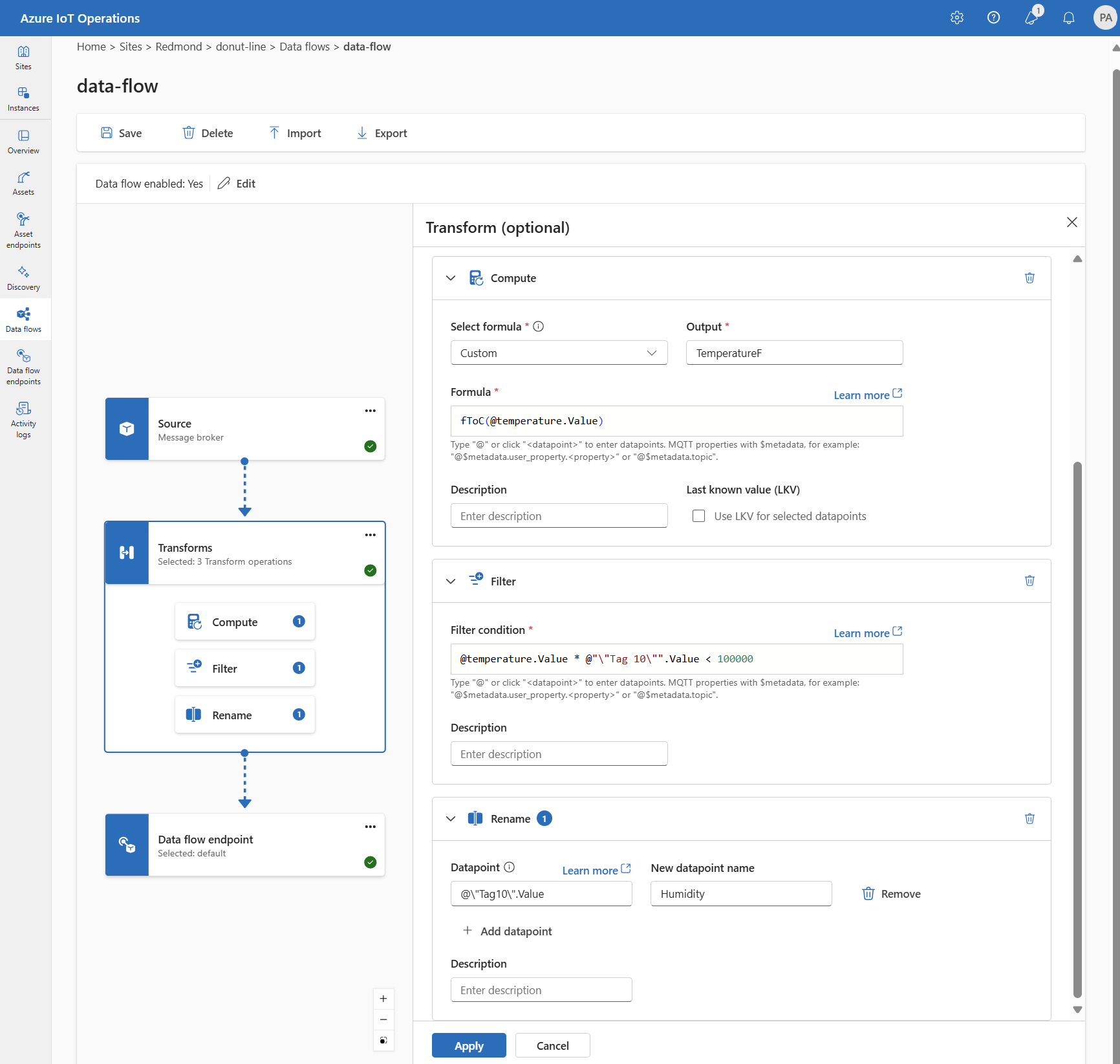 The following example is a data flow configuration that uses the MQTT endpoint for the source and destination. The source filters the data from the MQTT topic azure-iot-operations/data/thermostat. The transformation converts the temperature to Fahrenheit and filters the data where the temperature multiplied by the humidity is less than 100000. The destination sends the data to the MQTT topic factory.