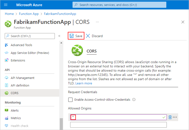On your function app, set up Cross-Origin Resource Sharing (CORS) so that all origins are permitted by following these steps: