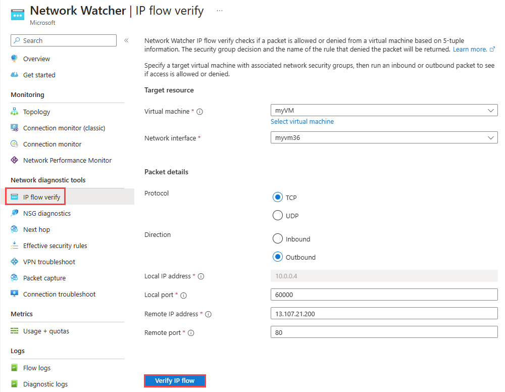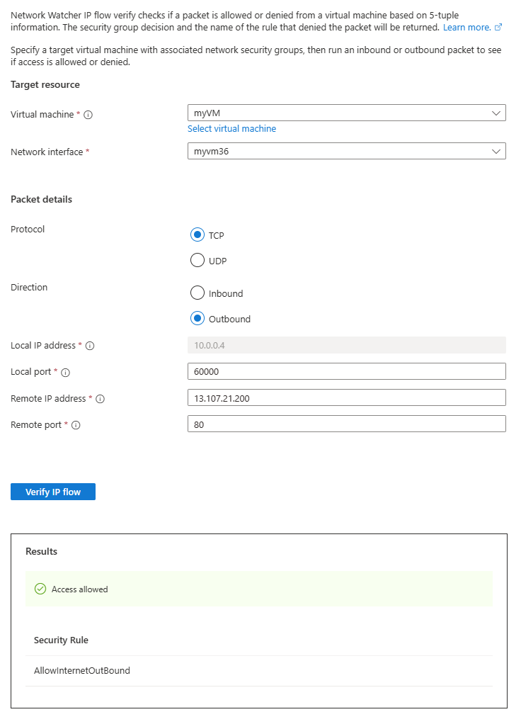 Setting Value Target resource Virtual machine Select myVM virtual machine. Network interface Select the network interface of myVM. When you use the Azure portal to create a virtual machine, the portal names the network interface using the virtual machine's name and a random number (for example myvm36). Packet details Protocol Select TCP. Direction Select Outbound. Local port Enter 60000. Choose any port number from the Internet Assigned Numbers Authority (IANA) range for dynamic or private ports. Remote IP address Enter 13.107.21.200. This IP address is one of the IP addresses of www.bing.comwebsite.Remote port Enter 80 Note