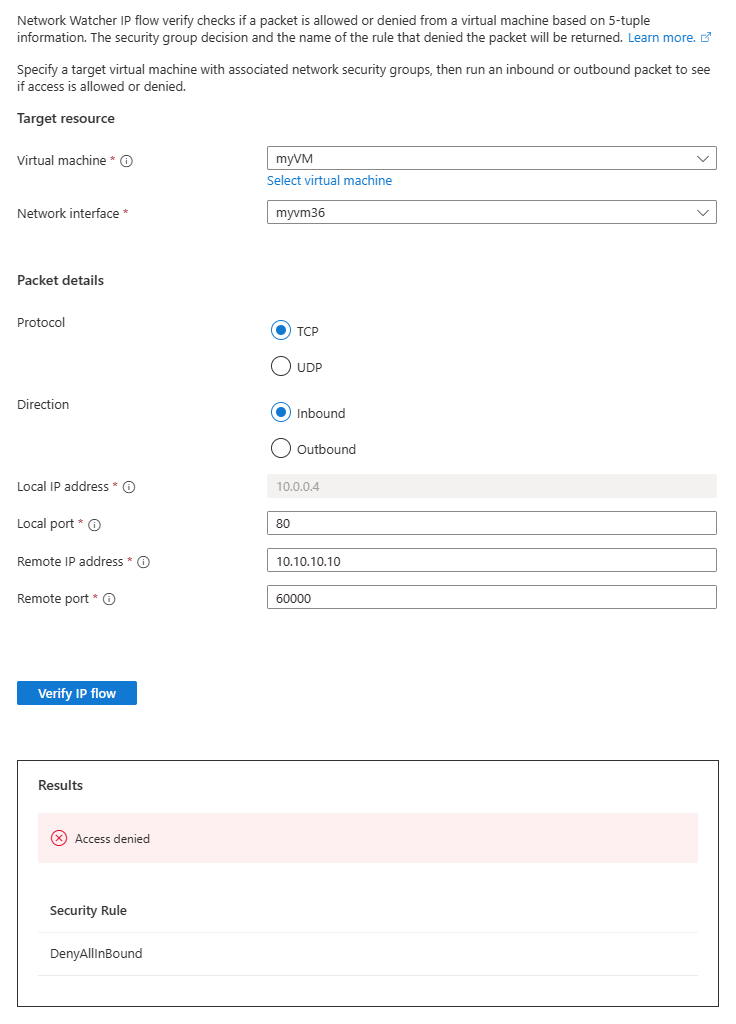 In this section, you use the IP flow verify capability of Network Watcher to test network communication to and from the virtual machine.