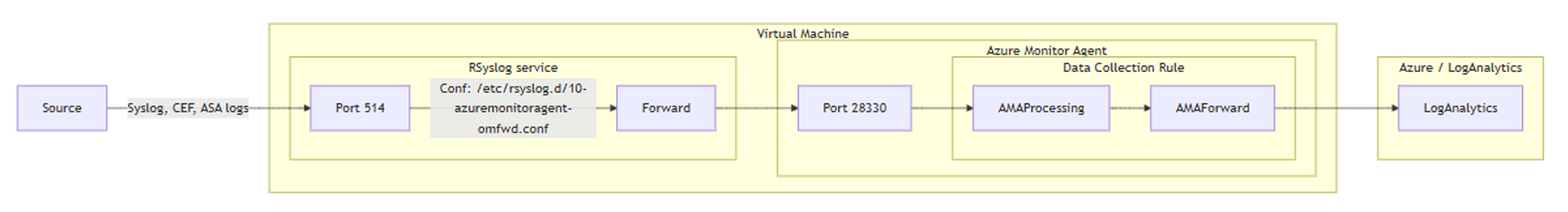 - RSyslog/Syslog-ng: Receives logs on port 514 and forwards them to AMA