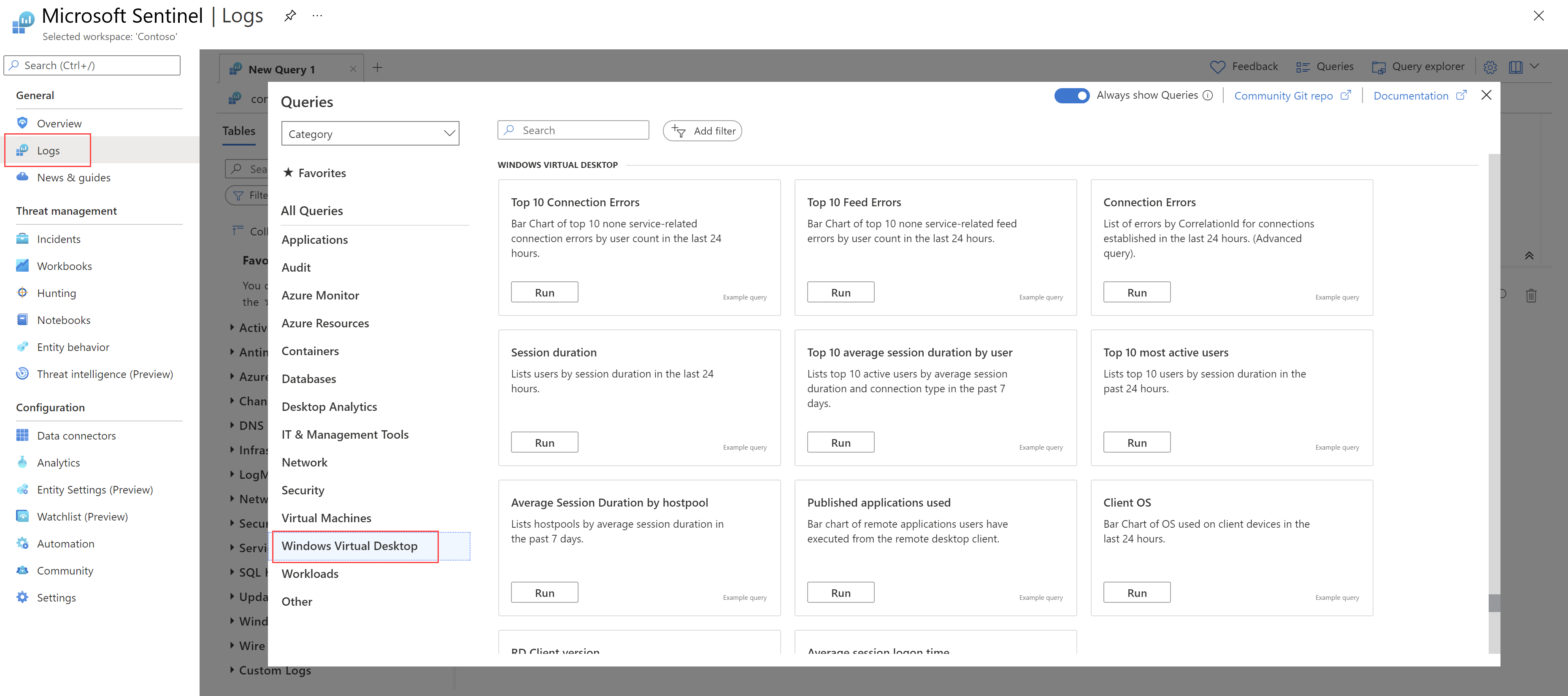 Microsoft Sentinel also provides built-in queries in the General > Logs > Azure Virtual Desktop area:
