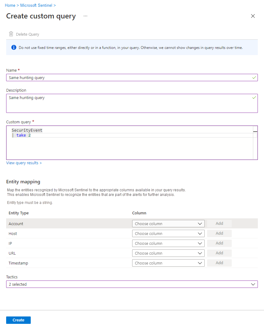 When your finished defining your query, select Create.