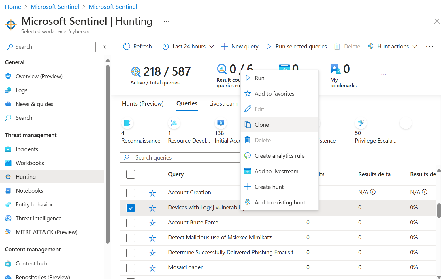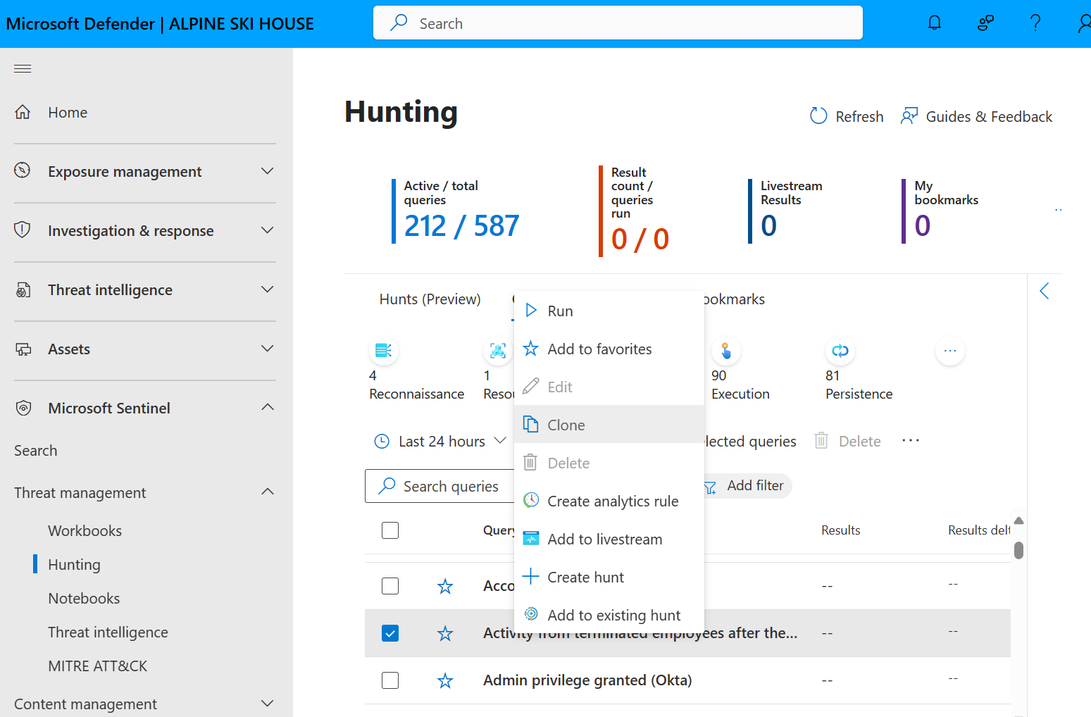 From the Hunting > Queries tab, select the hunting query you want to clone.