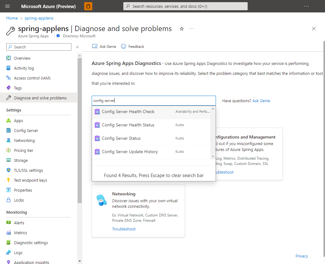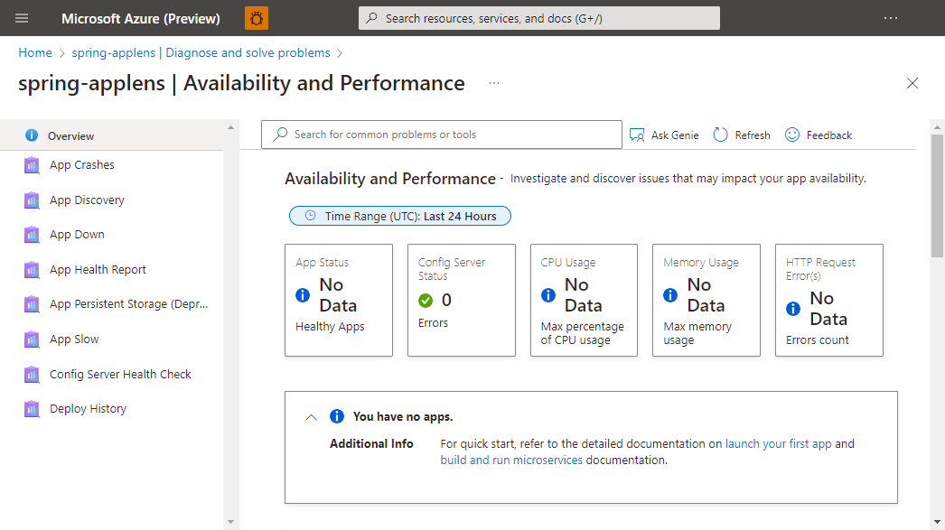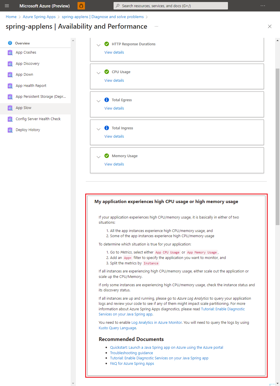 Azure Spring Apps diagnostics is an interactive experience to troubleshoot your app without configuration. Azure Spring Apps diagnostics identifies problems and guides you to information that helps troubleshoot and resolve issues.