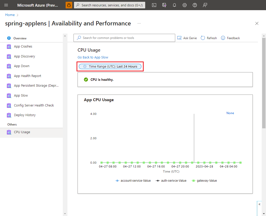 You can change the diagnostic time range with the controller for CPU Usage. There can be a 15-minute delay for metrics and logs.