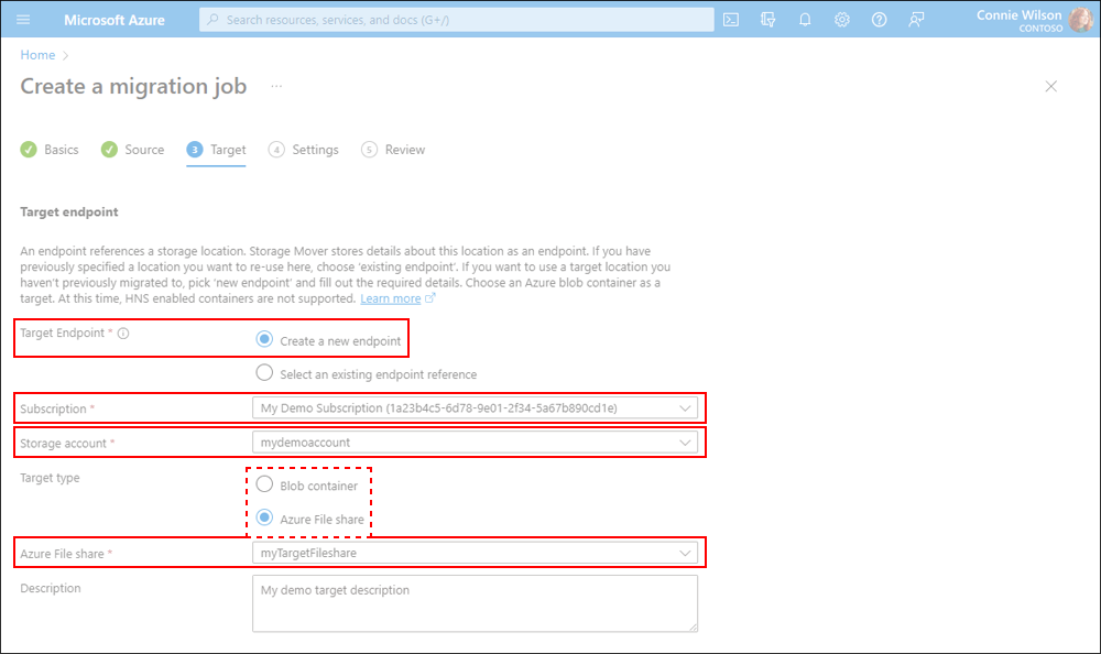 Similarly, to define a new target endpoint, choose the Create a new endpoint option. Next, select values from the drop-down lists for the required Subscription and Storage account fields. You can also add an optional description value of less than 1024 characters. Depending on your use case, select the appropriate *Target type.