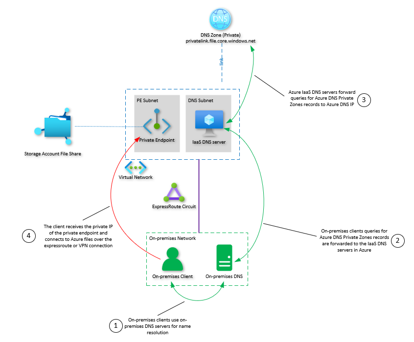 *.core.windows.net(or the appropriate storage endpoint suffix for the US Government, Germany, or China national clouds) to a DNS server virtual machine hosted within your Azure virtual network. This DNS server will then recursively forward the request on to Azure's private DNS service, which will resolve the FQDN of the storage account to the appropriate private IP address. This is a one-time step for all the Azure file shares hosted within your virtual network.Use Azure DNS Private Resolver: If you don't want to deploy a VM-based DNS server, you can accomplish the same task using Azure DNS Private Resolver.