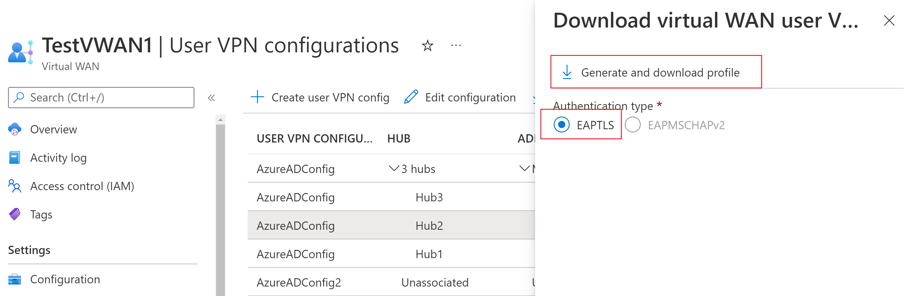 On the Download virtual WAN user VPN page, select EAPTLS, then click Generate and download profile. A profile package (zip file) containing VPN client configuration settings is generated and downloads to your computer. The contents of the package depend on the hubs and the authentication and tunnel type choices for the configuration that you selected.
