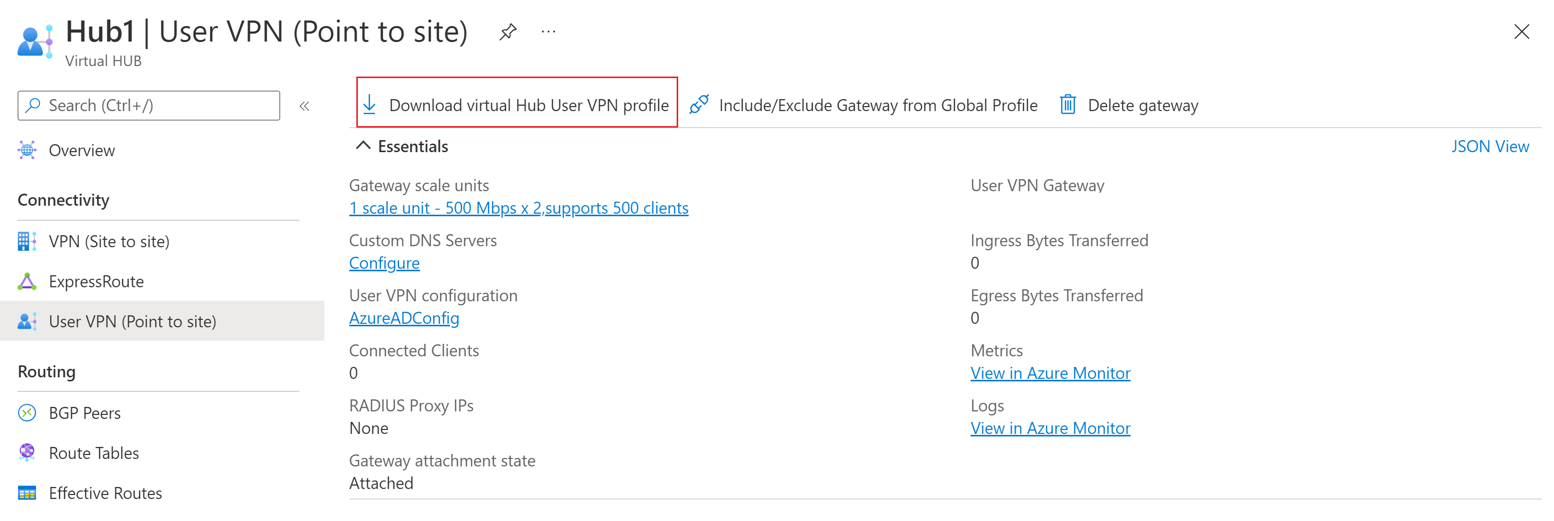 On the User VPN (Point-to-site) page, see Gateway attachment state to determine if this hub is included in the global VPN profile. If the state is attached, the hub is included. If the state is detached, the hub isn't included.