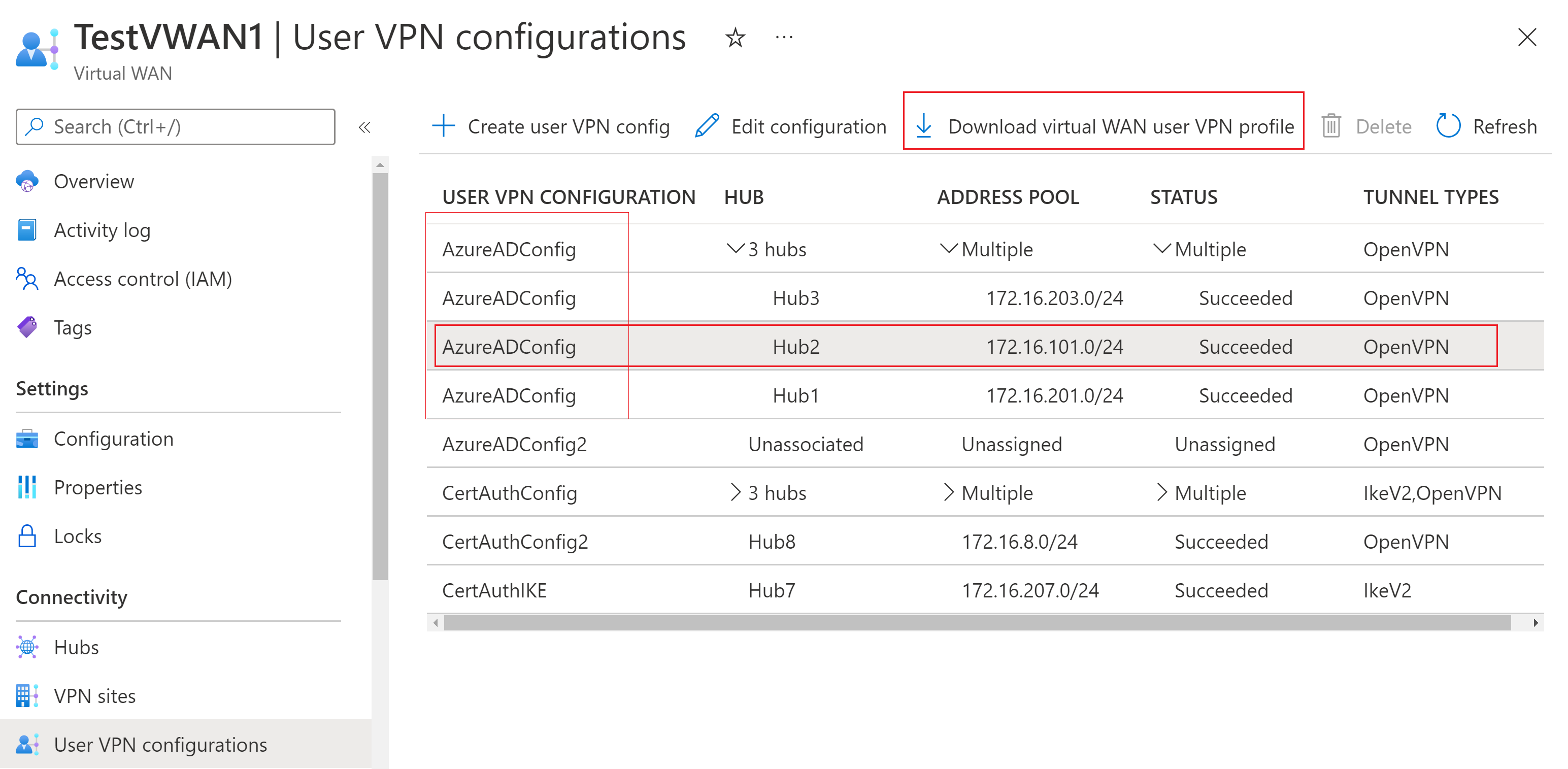 Click a line containing the User VPN Configuration you want to use. This highlights the entire line. Then, click Download virtual WAN user VPN profile.